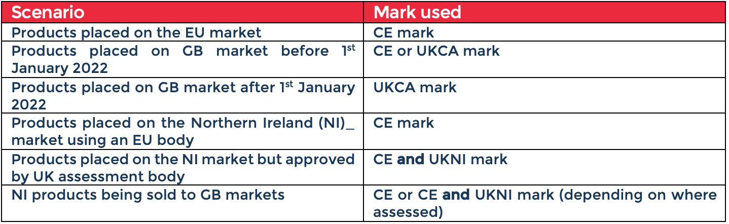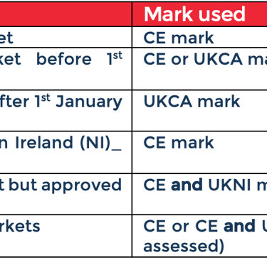 The CE, UKCA and UKNI marks are all conformity marks. The presence of one of these marks on a product indicates it has passed the required assessment for the market. This means it has passed environmental, safety and health protection standards for the area it is being sold. Not all goods require conformity marks. Generally, it applies to manufactured goods, including machinery, medical devices, toys, PPE and measuring instruments. A full list of products that need the marks can be viewed here. If you are a manufacturer of one of these types of product, you need to carry out a conformity assessment and, once the evaluation is passed, use the mark in order to be able to sell it. In some cases, you may need a third party to carry out an independent assessment. Goods that are found to not comply with standards, even if they have a mark on, will be removed from the market and the manufacturer may be subject to a fine or even legal action. A brief table of when different marks apply can be seen below: